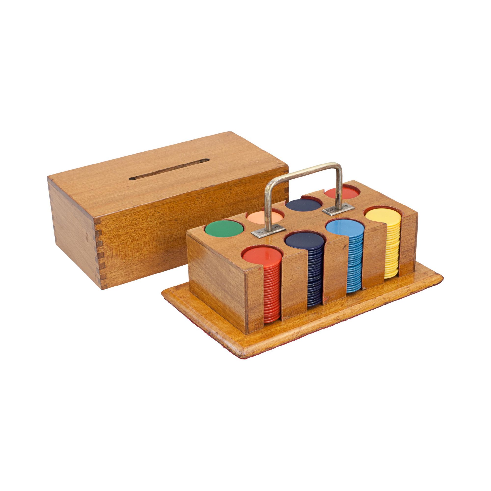 A nice set of gambling counters (poker, gambling, gaming chips) in a rectangular beech-wood keeper with brass central carry handle and a lift off lid. The carrier contains eight individual circular slots containing coloured gaming chips in each slot, red (46), dark blue (48), green (24), light blue (27), yellow (24) & pink (24). The whole container is in great condition, as well as the poker chips.
