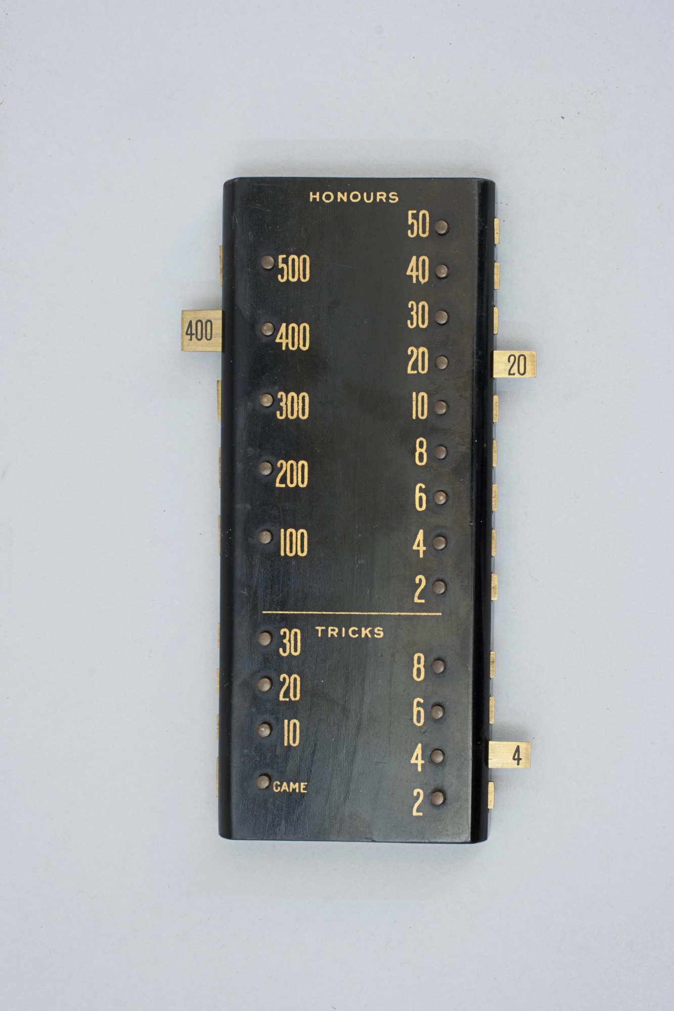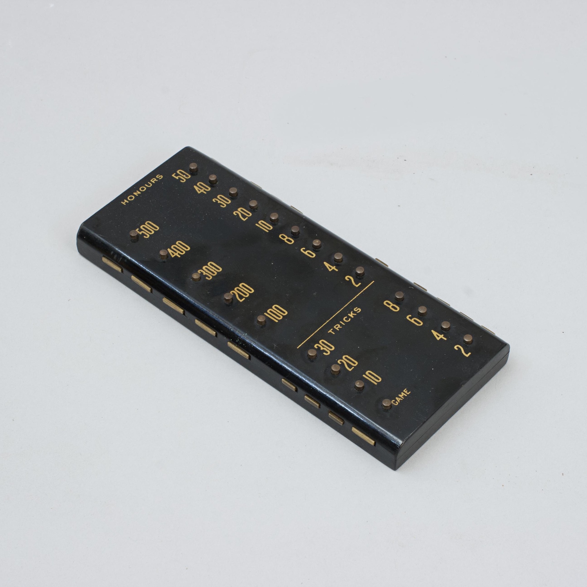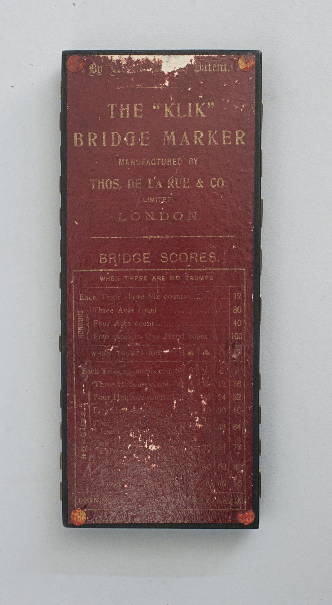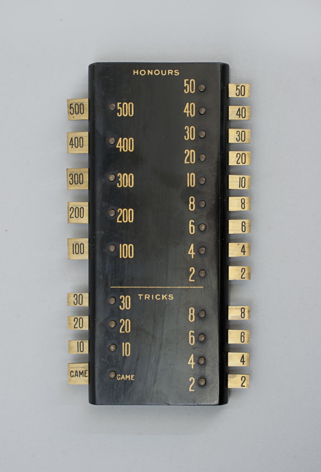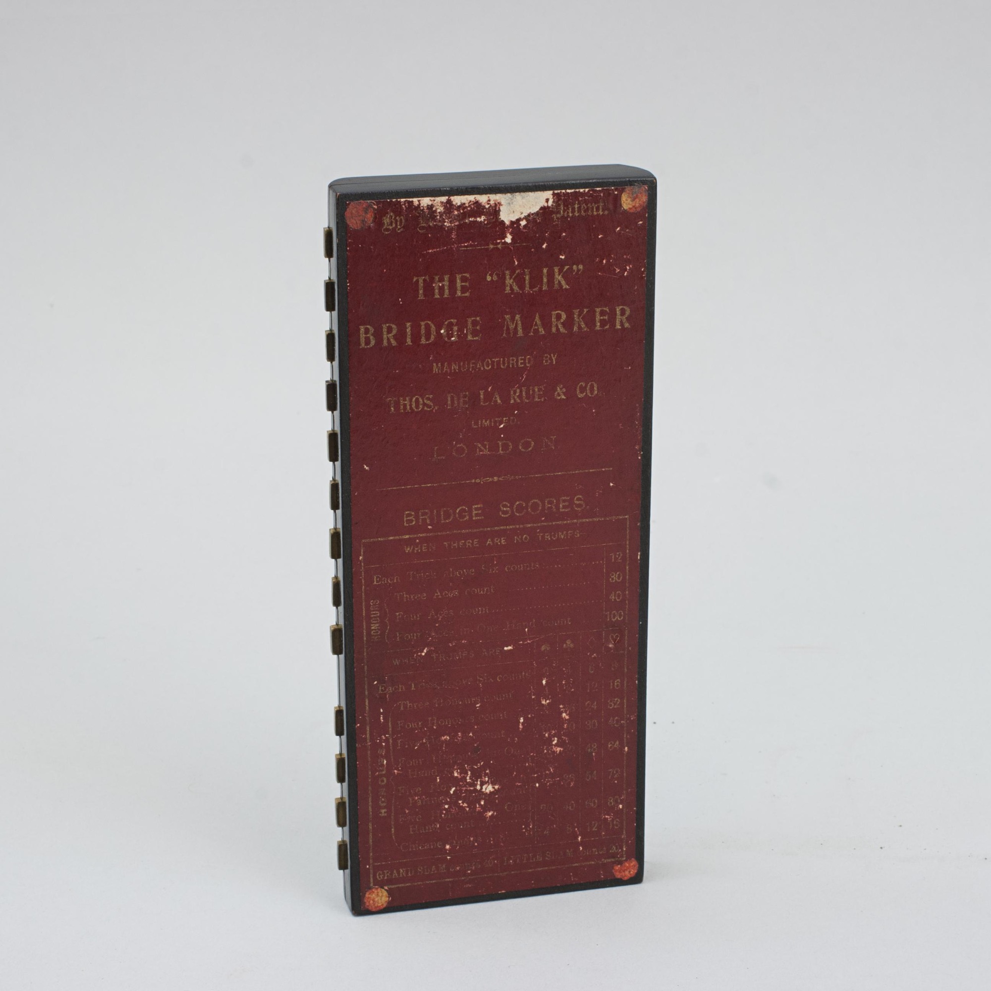 An unusual bridge marker manufactured by Thos De La Rue & Co. Ltd. London, made of ebonized wood with brass score markers. The front of the scorer displays scores for 'Honours' (2, 4, 6, 8, 10, 20, 30, 40, 50, 100, 200, 300, 400, 500) and 'Tricks' (2, 4, 6, 8, 10, 20, 30 & GAME) in gold lettering. The scores are sprung loaded and are released by pressing the little brass button next to the corresponding score, the flags (scores) are easily pressed back in. To the rear is a paper label (slightly scratched) 'By Royal Letters Patent, The "Klik" Bridge Marker, Manufactured By Thos De La Rue & Co. Ltd. London. Bridge Scores, when there are no TRUMPS:- Each Trick above Six counts ...12. HONOURS Three Aces count ...30, Four Aces count ...40, Four Aces in One Hand count 100. It then goes on to list the points for when there are Trumps.