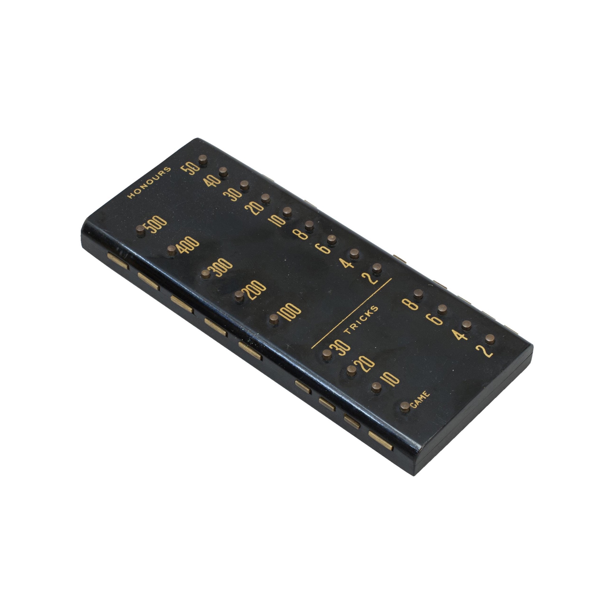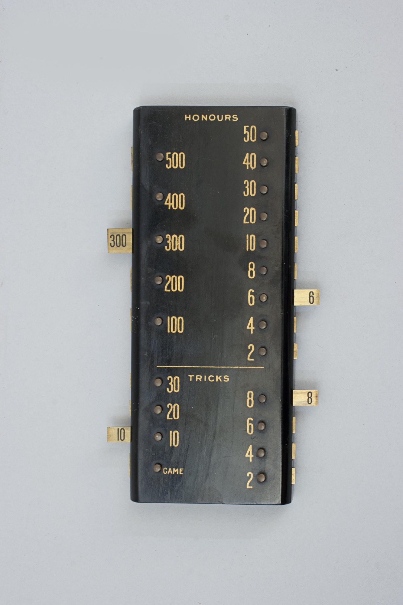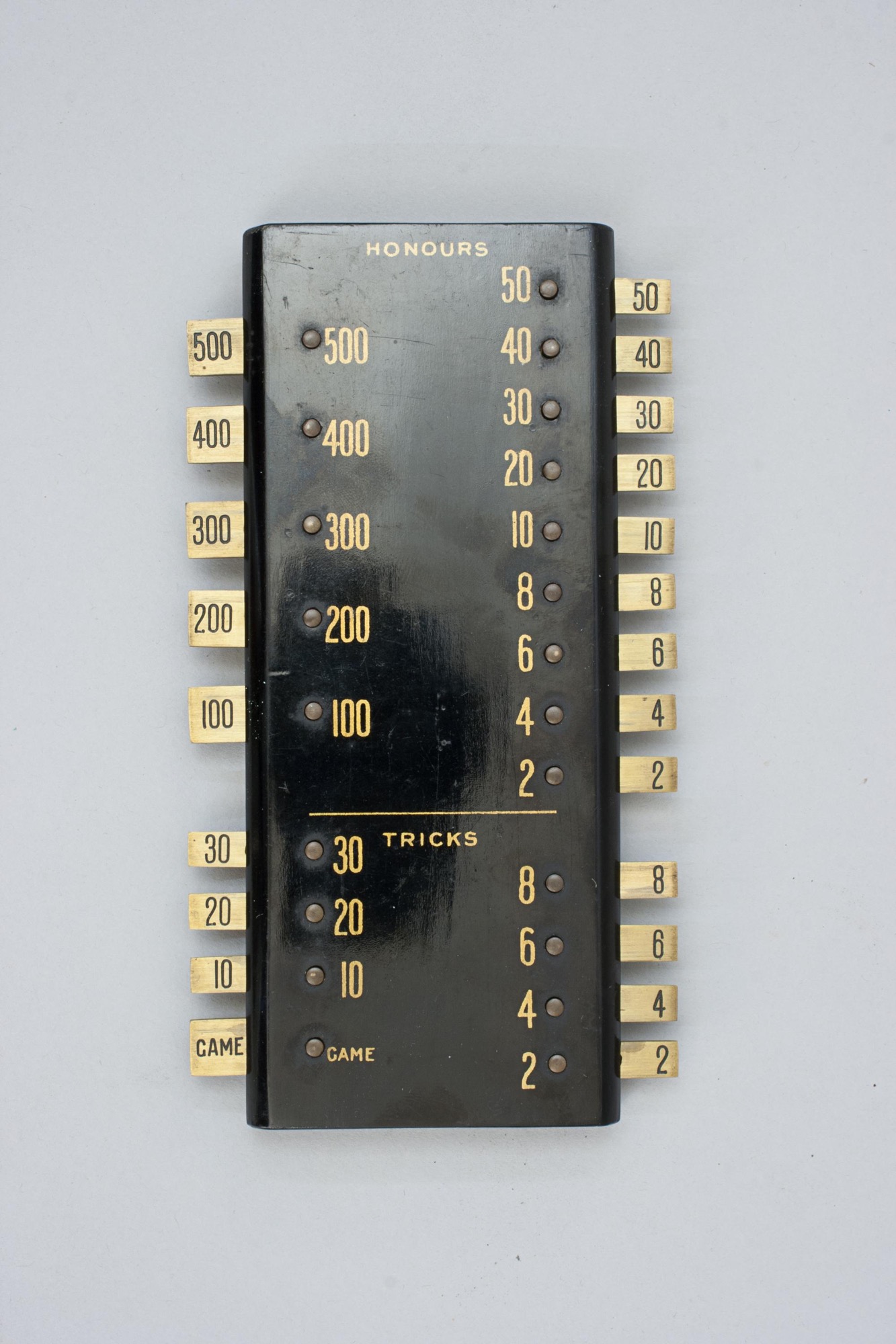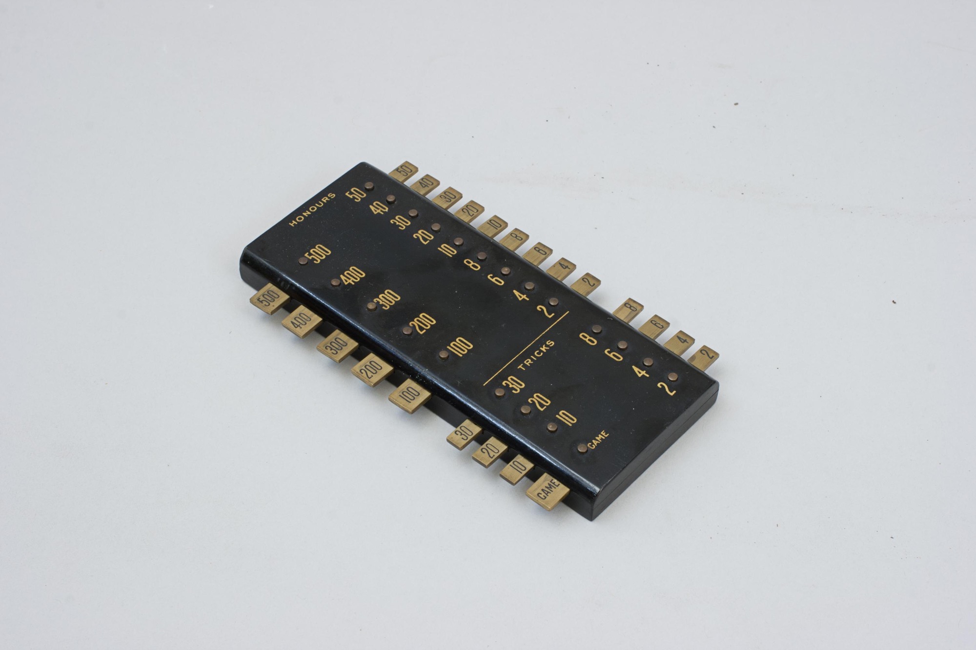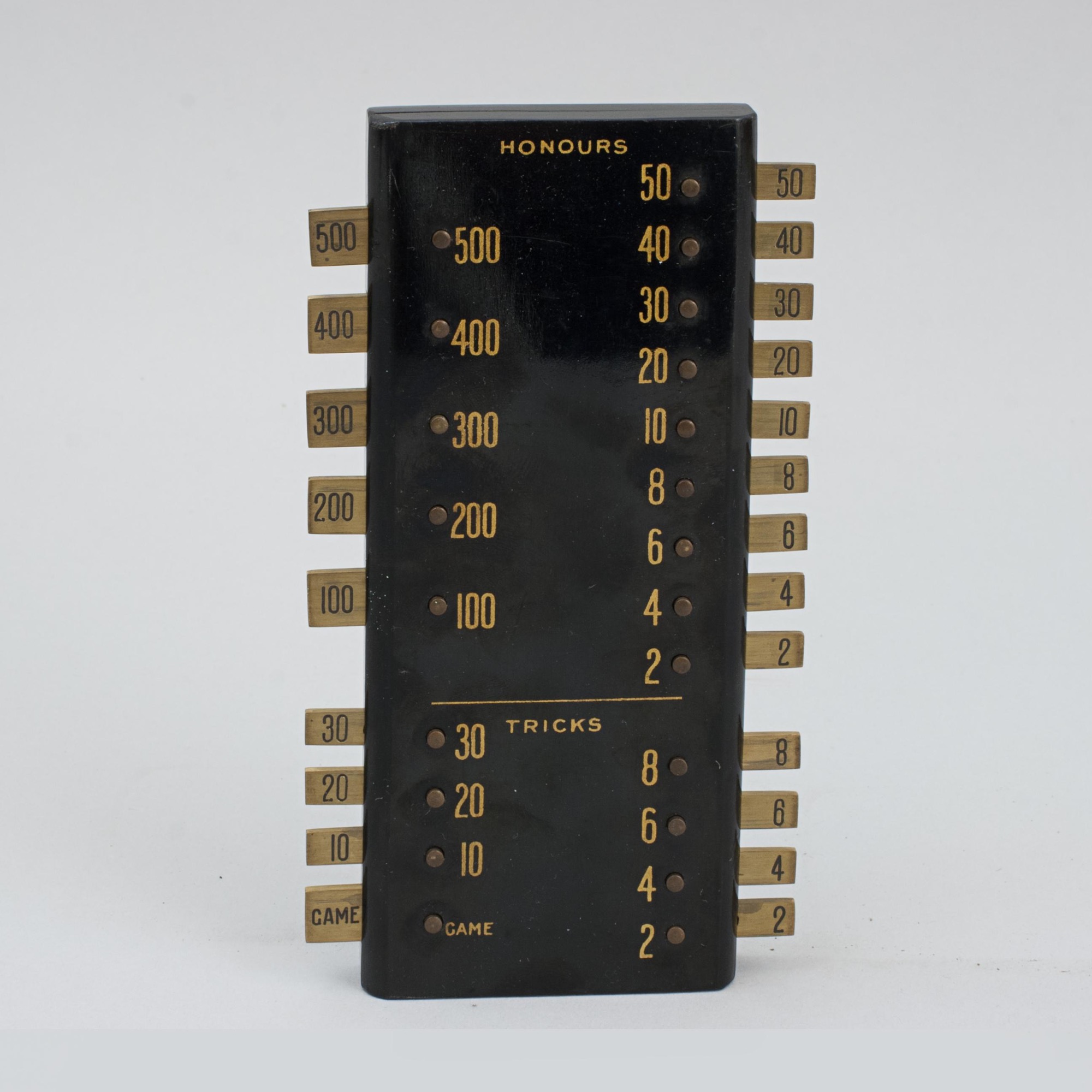 An unusual bridge marker manufactured by Thos De La Rue & Co. Ltd. London, made of ebonized wood with brass score markers. The front of the scorer displays scores for 'Honours' (2, 4, 6, 8, 10, 20, 30, 40, 50, 100, 200, 300, 400, 500) and 'Tricks' (2, 4, 6, 8, 10, 20, 30 & GAME) in gold lettering. The scores are sprung loaded and are released by pressing the little brass button next to the corresponding score, the flags (scores) are easily pressed back in. To the rear is a paper label (slightly scratched) 'By Royal Letters Patent, The "Klik" Bridge Marker, Manufactured By Thos De La Rue & Co. Ltd. London. Bridge Scores, when there are no TRUMPS:- Each Trick above Six counts ...12. HONOURS Three Aces count ...30, Four Aces count ...40, Four Aces in One Hand count 100. It then goes on to list the points for when there are Trumps.