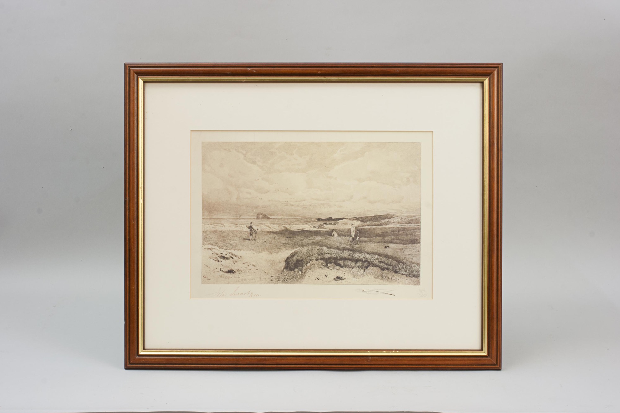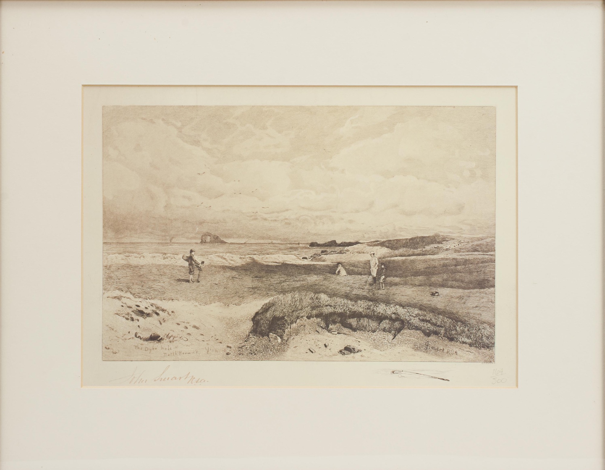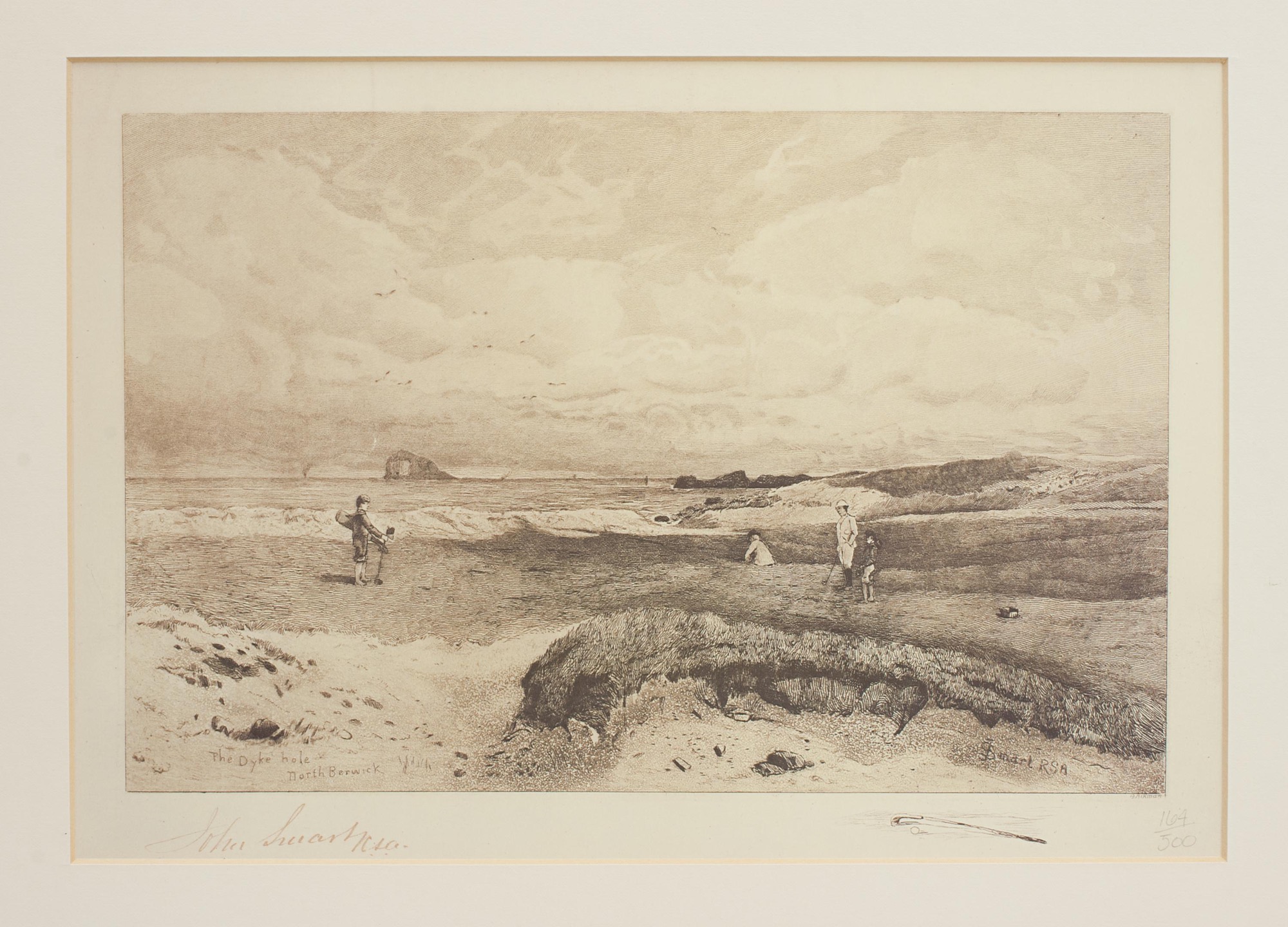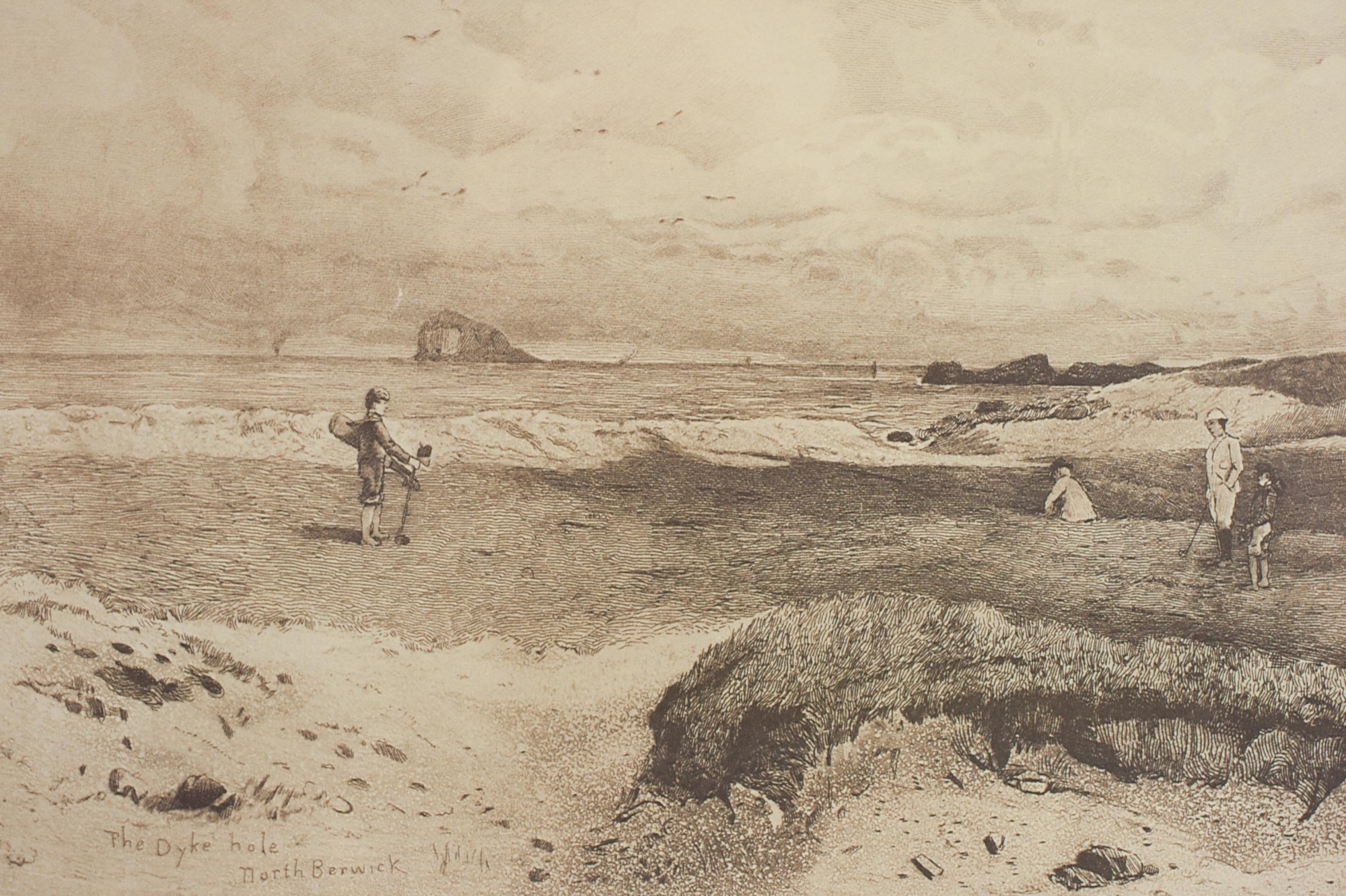 The Dyke Hole North Berwick, after John Smart RSA 1839 - 1899. John Smart painted scenes of Scottish golf courses for a bound folio in 1893. George Aikman produced the etchings from Smart's water colours for the book, which was originally published as a limited edition of 100 copies. The etching has been framed in a modern frame with mount.