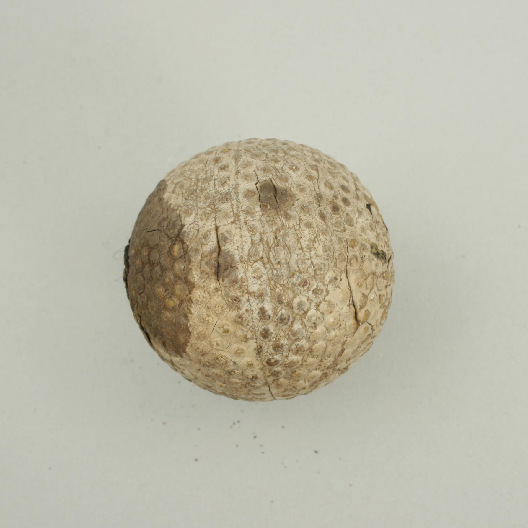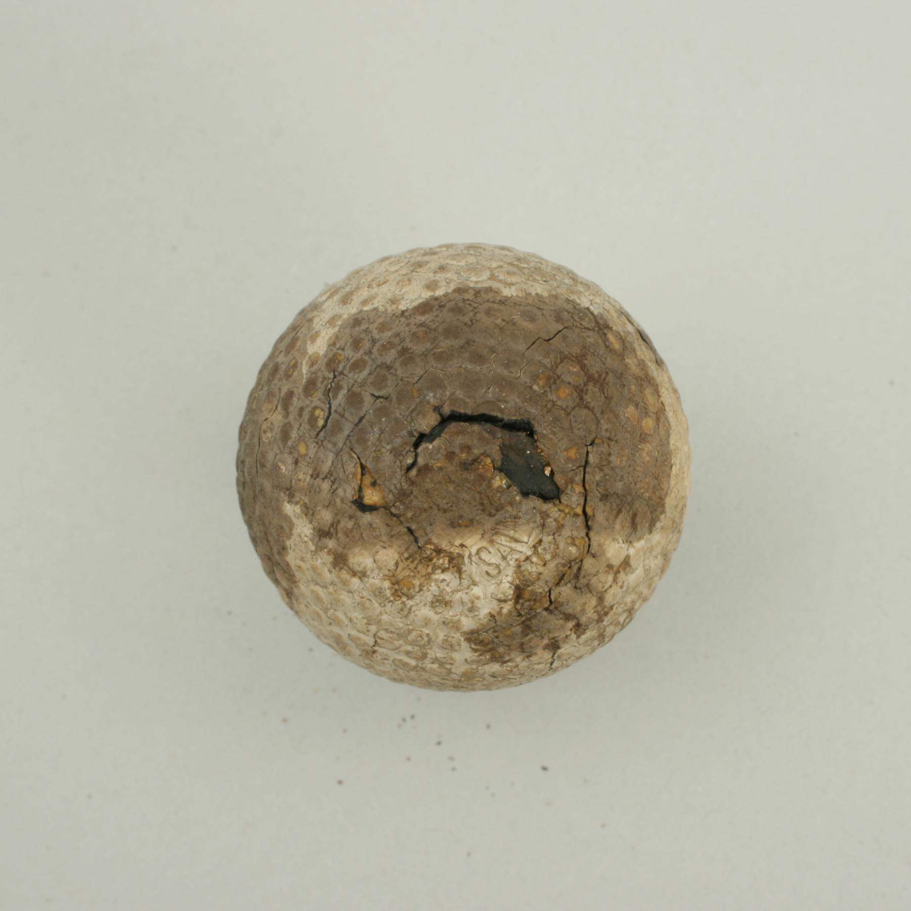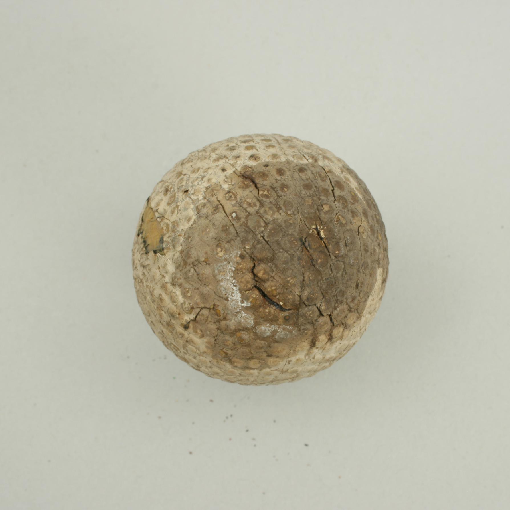 A bramble patterned rubber core golf ball. The golf ball is in fair condition, it is named but can not make it out. The surface is damaged.