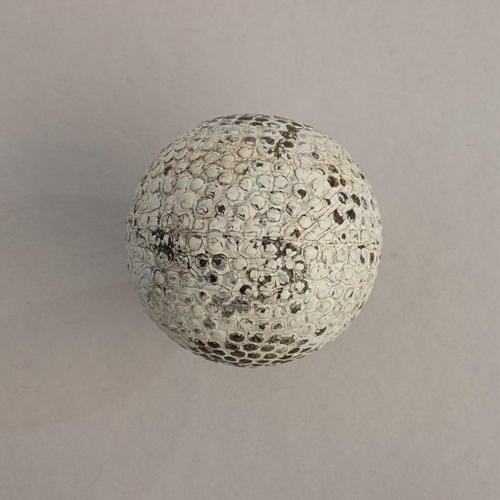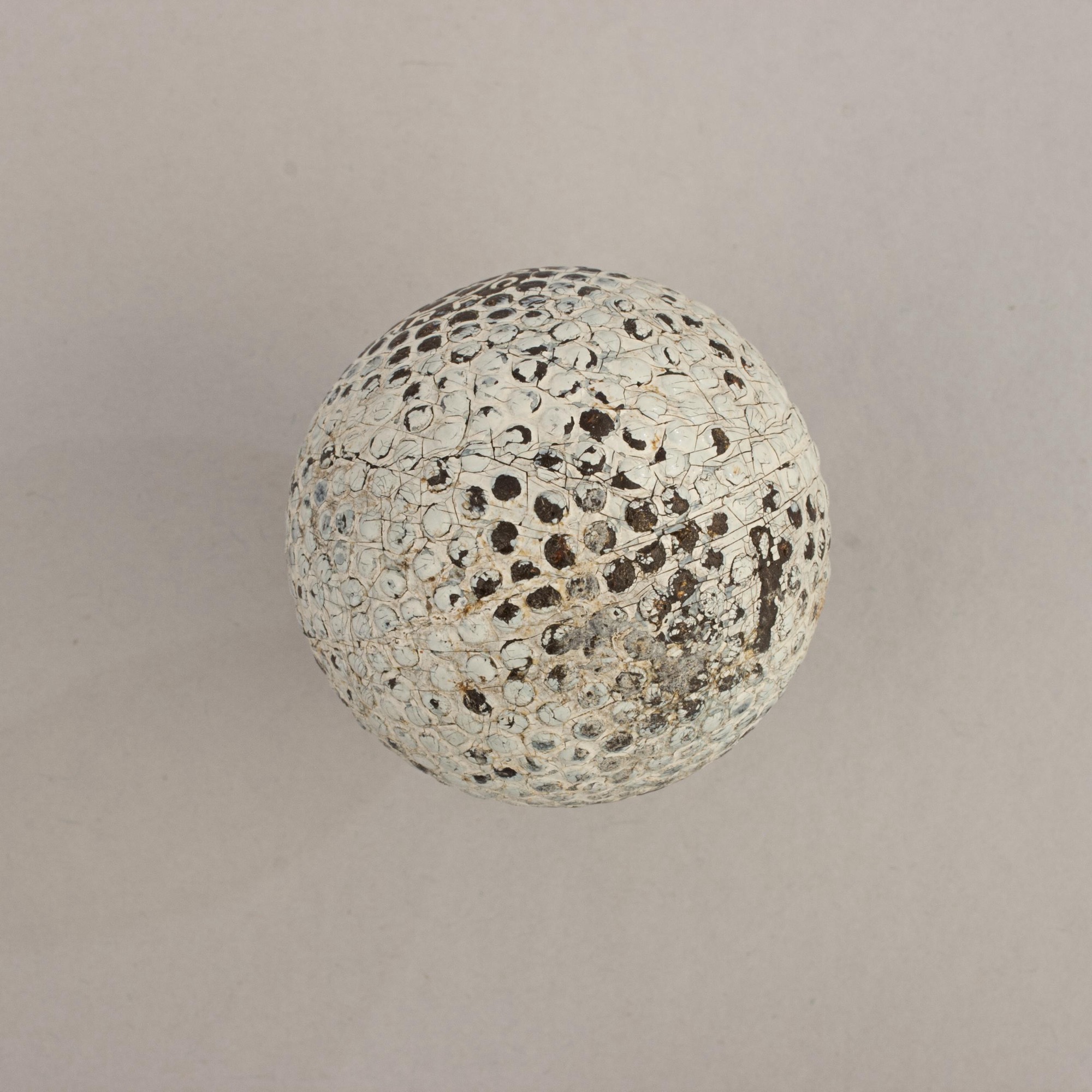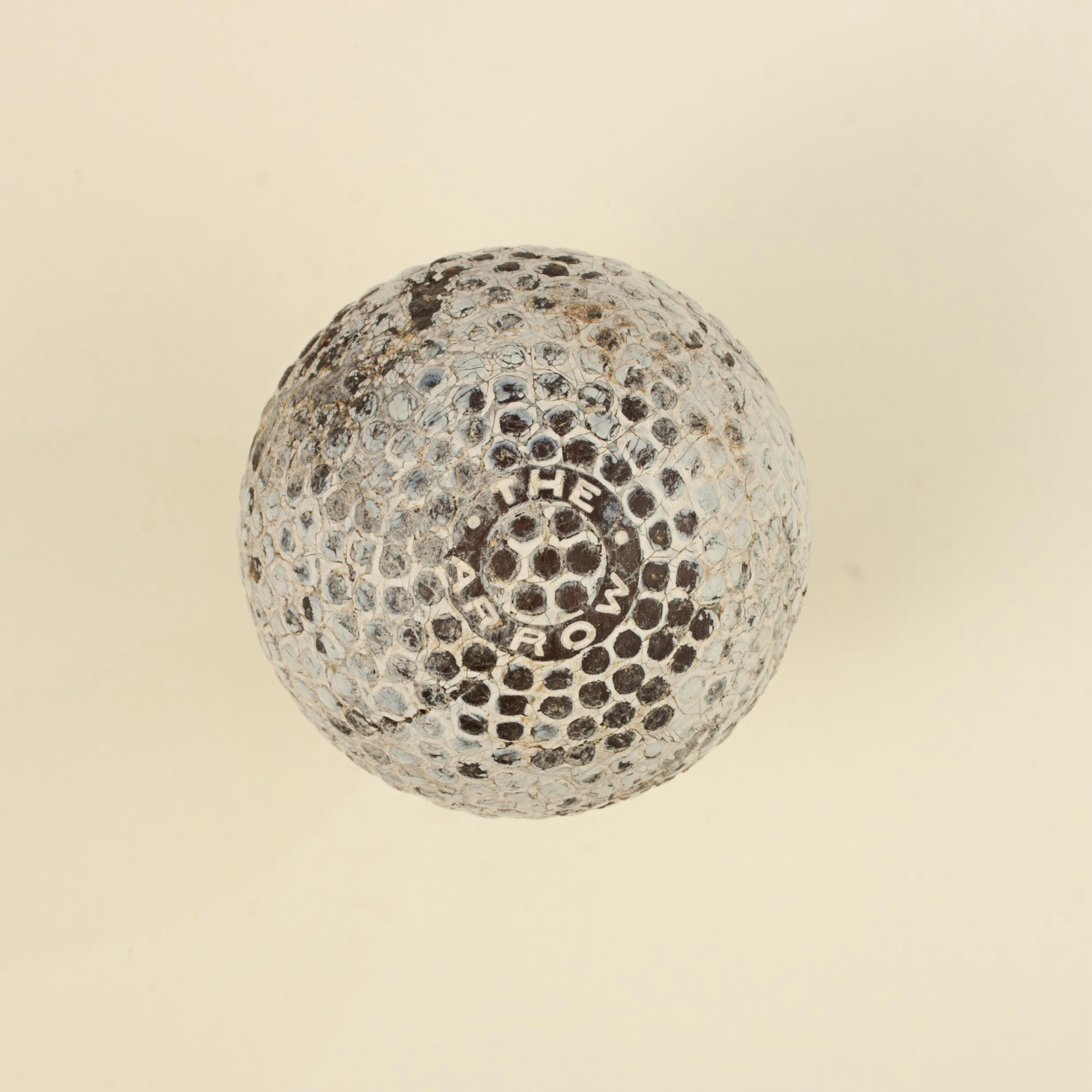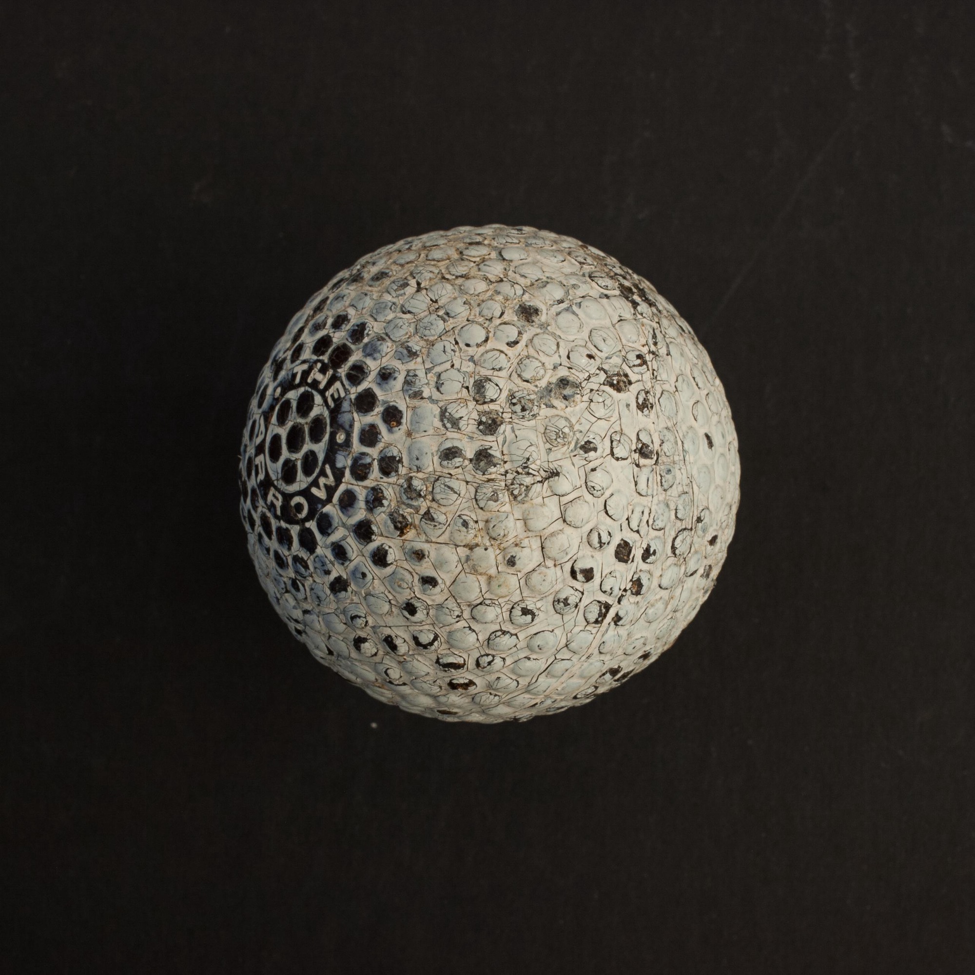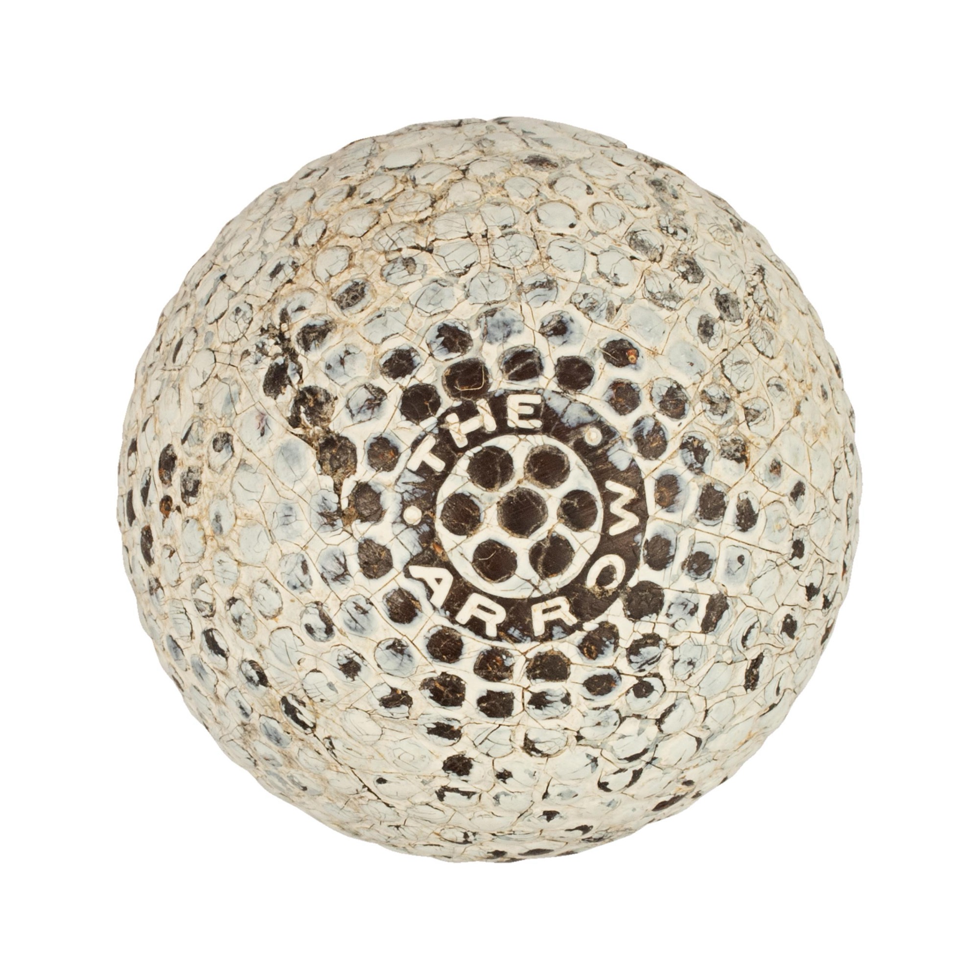 A good example of 'The Arrow' bramble patterned rubber core golf ball. The golf ball is in good condition and is manufactured by Goodyear Tire & Rubber, Ohio, USA. The ball name 'The Arrow' in inverted lettering on a circular band on both poles of the ball with seven brambles in the center. The ball is with the classic bramble pattern, raised dimples, and is quite a rare and historical ball as it was made at the very early stages of the rubber core era.