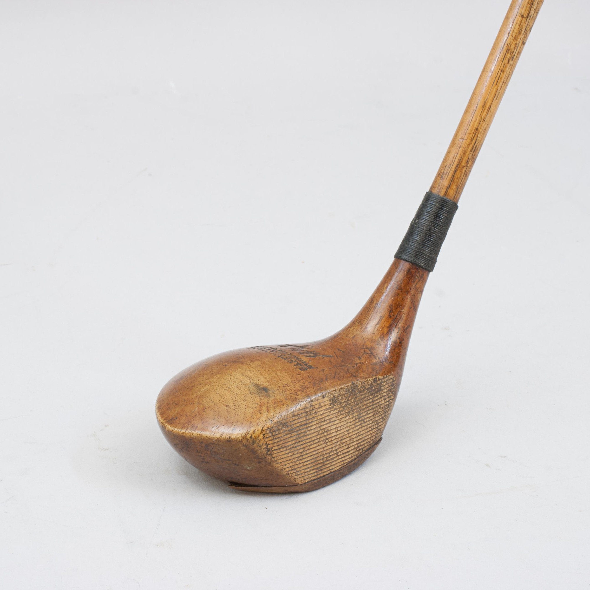 A typical period socket head persimmon wood driver, by Cann And Taylor. This great looking club has a polished club head, lead weight to the rear and the traditional horn slip along the leading edge of the sole. The head is stamped 'Cann & Taylor, Autograph Reg. No. 303868' with the J. H. Taylor "Autograph". The hickory shaft fitted with a suede leather grip.