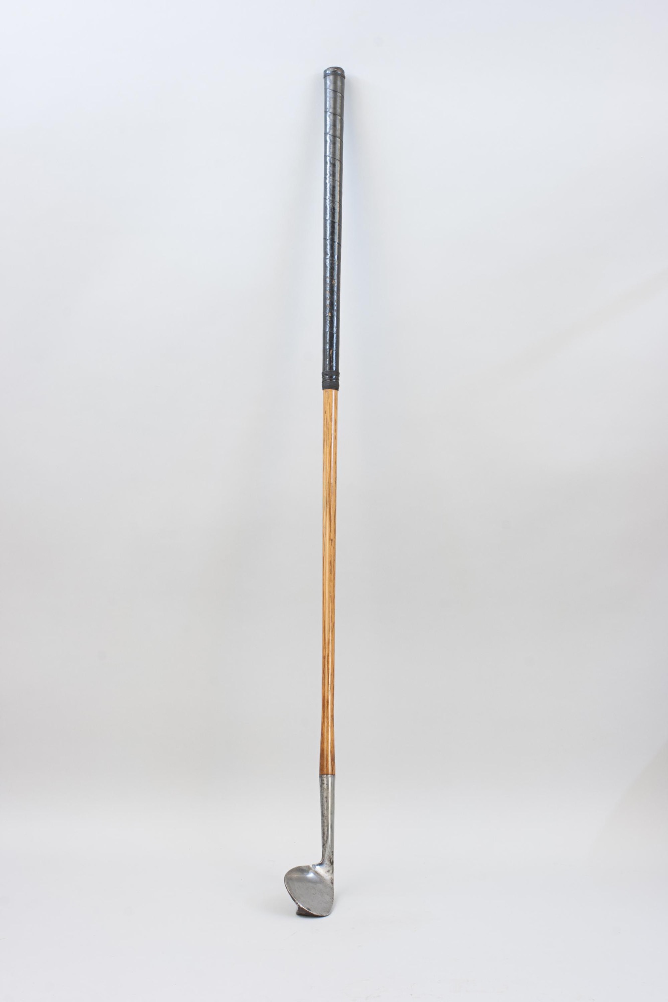 A smooth concave faced niblick by William Gibson & Co, Kinghorn, Fife. The heavy weighted hickory shafted niblick (sand wedge) golf club with deep flange, original shaft with polished leather grip and stamped 'Gibson's Star A'. The base of the flange stamped 'Made In Scotland, hand forged, Gibsons of Kinghorn, "The Skoogee" NIBLICK' with Gibson's 'DEEP STRUCK STAR' cleek mark.