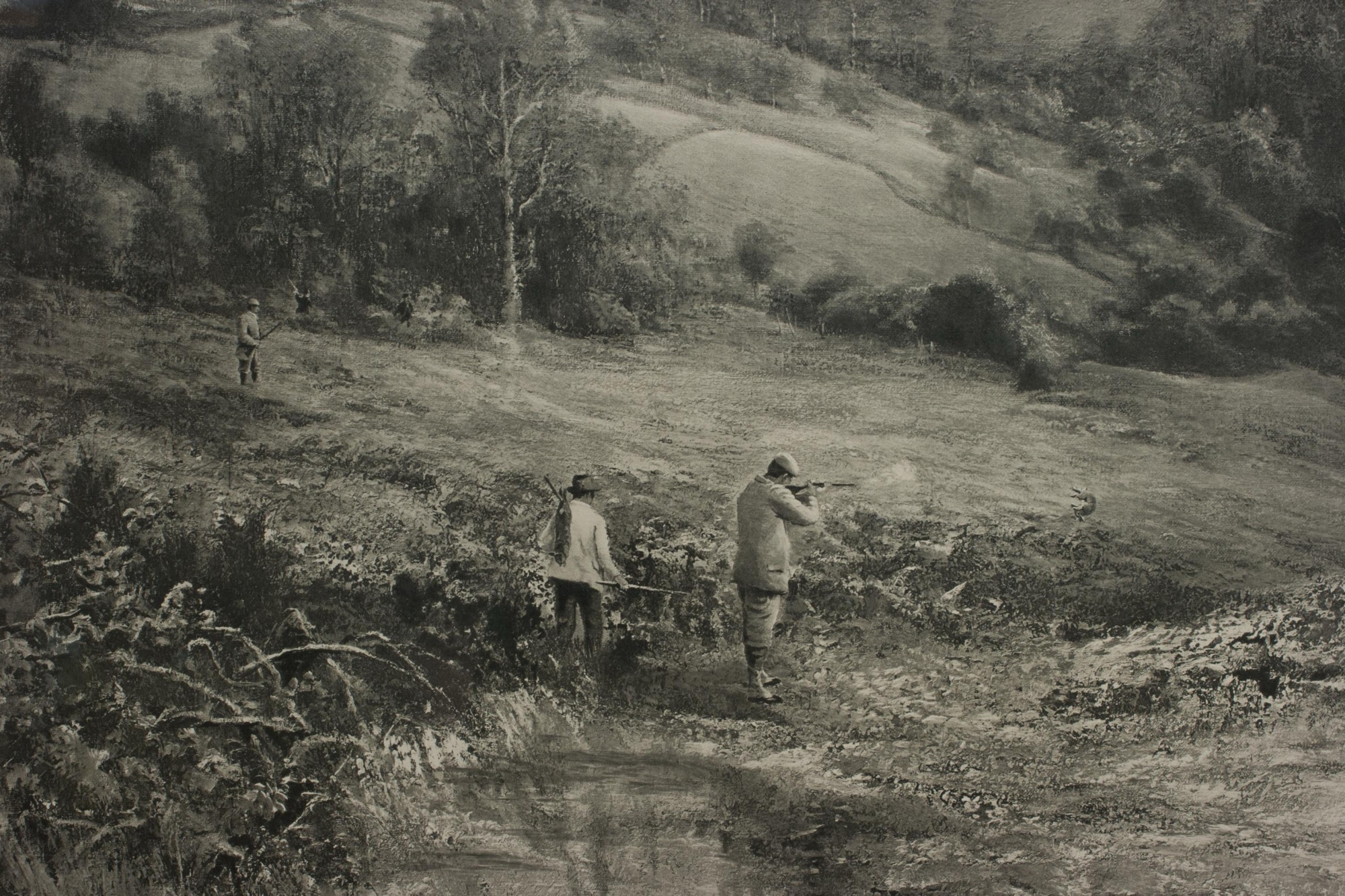 Titled Rabbit Shooting, the scene vividly captures the spirit of the shooting season. Set in a picturesque tree-lined valley, the print portrays a sportsman at the height of action, having just shot a rabbit, which tumbles through the air, while another gentleman stands ready with his gun in the background. Adams' masterful use of light, perspective, and composition lends the scene both atmosphere and vitality, making it a quintessential example of late 19th-century British sporting art.