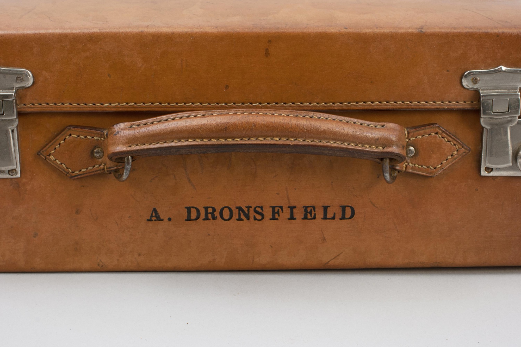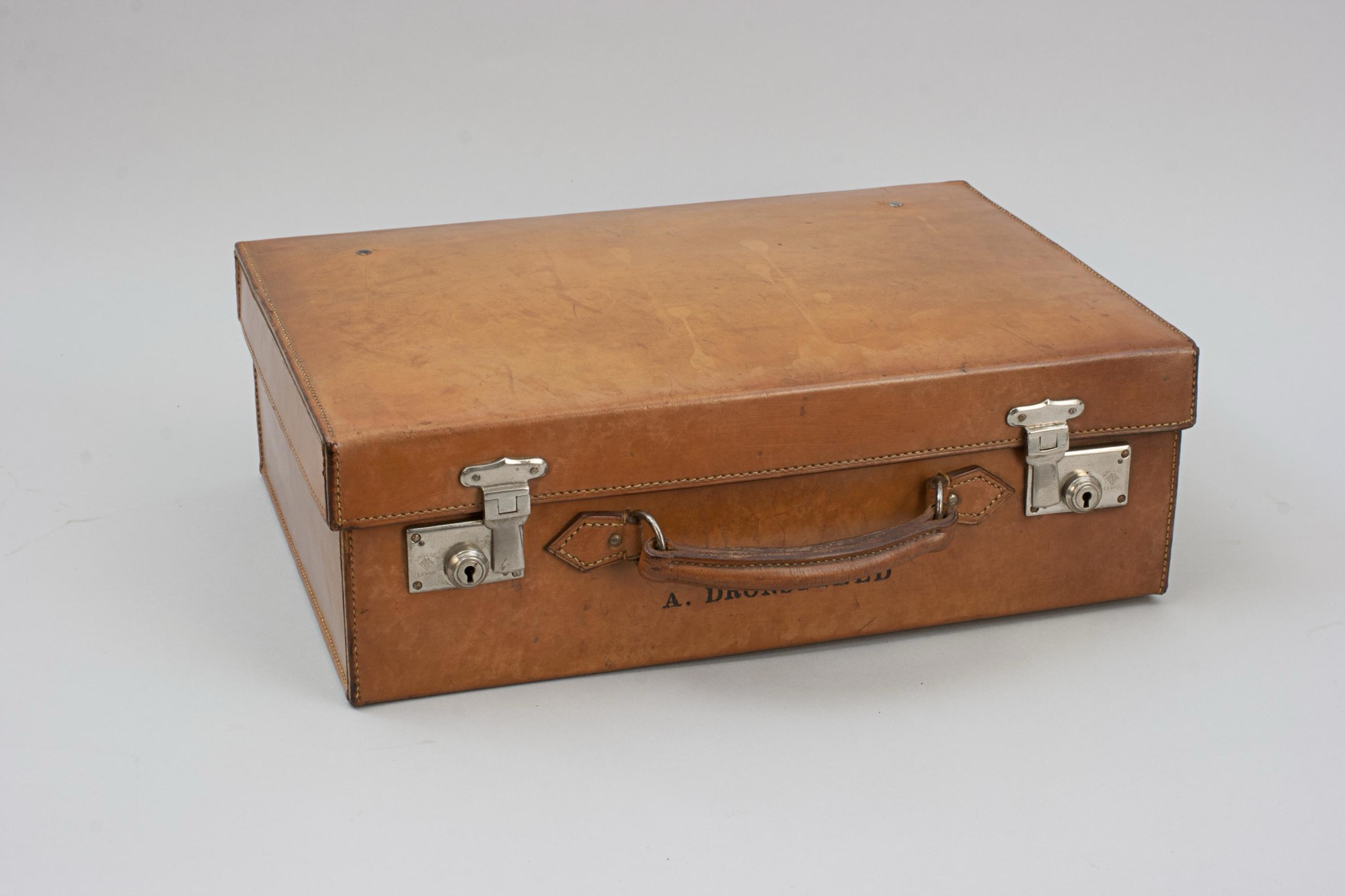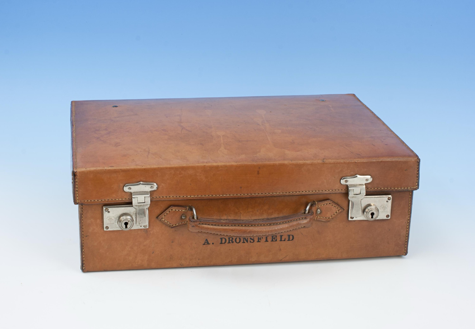 A fine tan leather case with single leather carry handle and two working nickel plated locks, with key, and four nickel stud feet. The interior of this small suitcase, briefcase, attaché case is in great condition, spacious, a suitable for carrying overnight clothes, paperwork, folders, or possibly a small laptop or tablet. The case is in good original condition, embossed with the original owners name "A. Dronsfield".