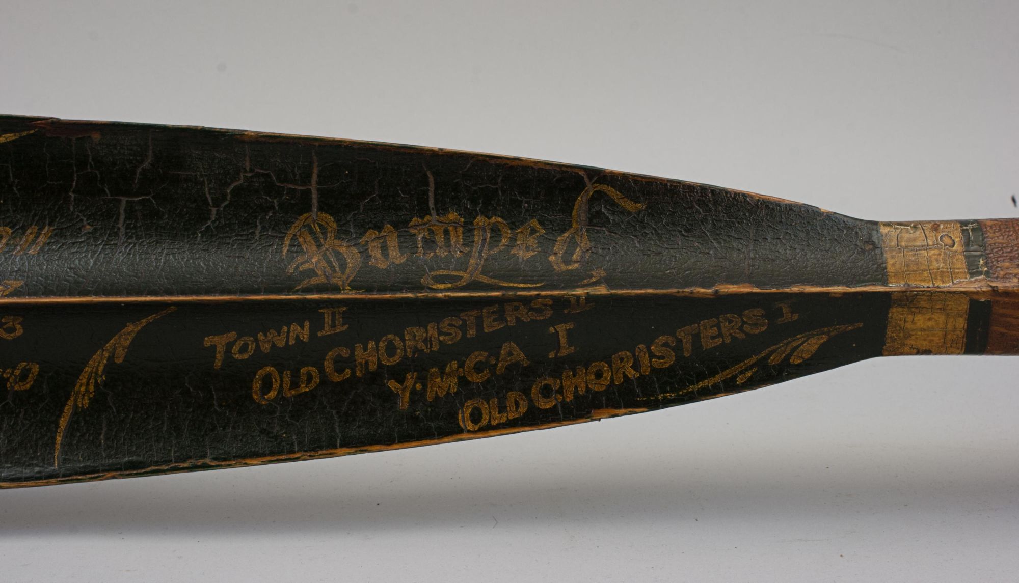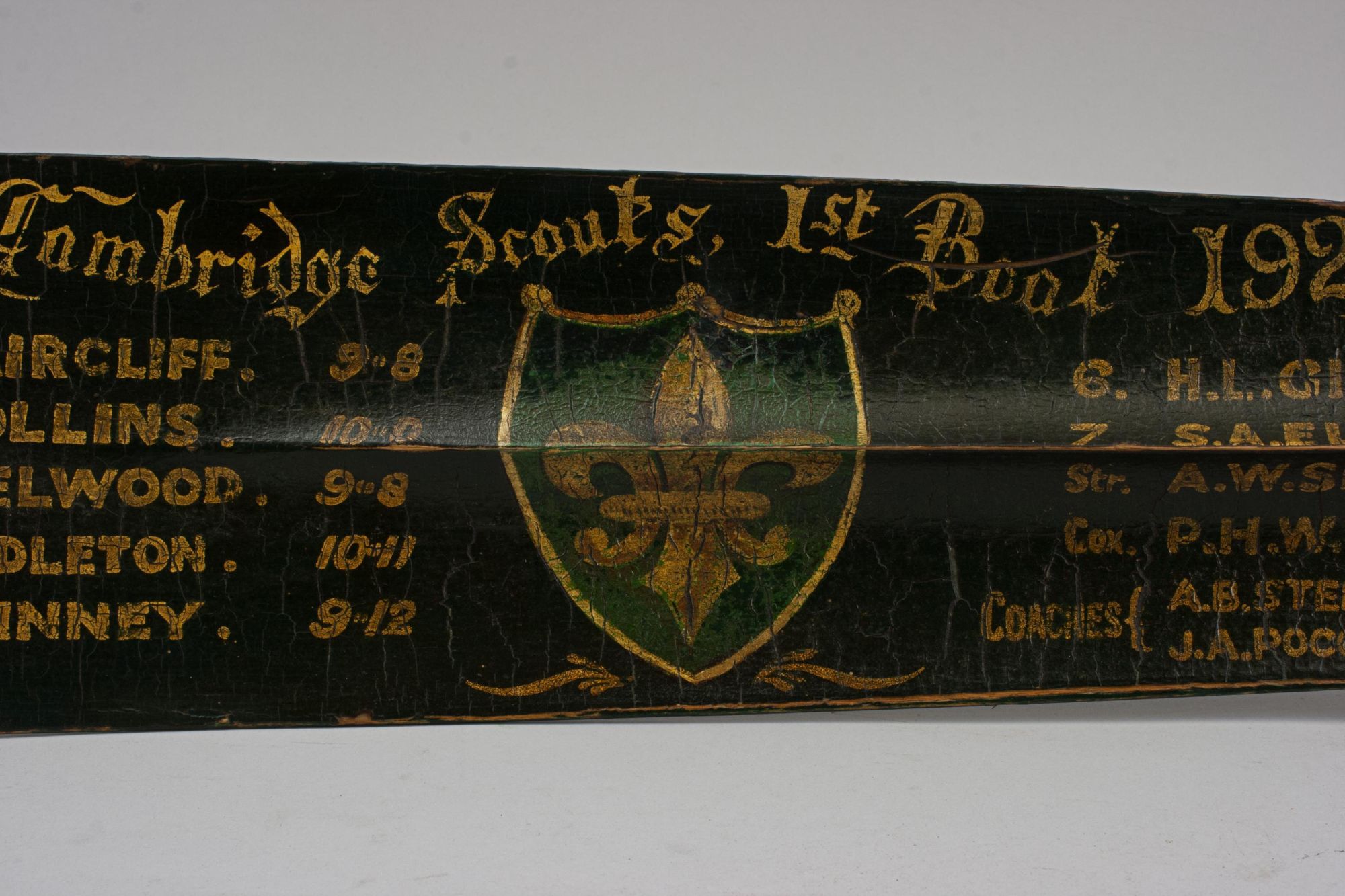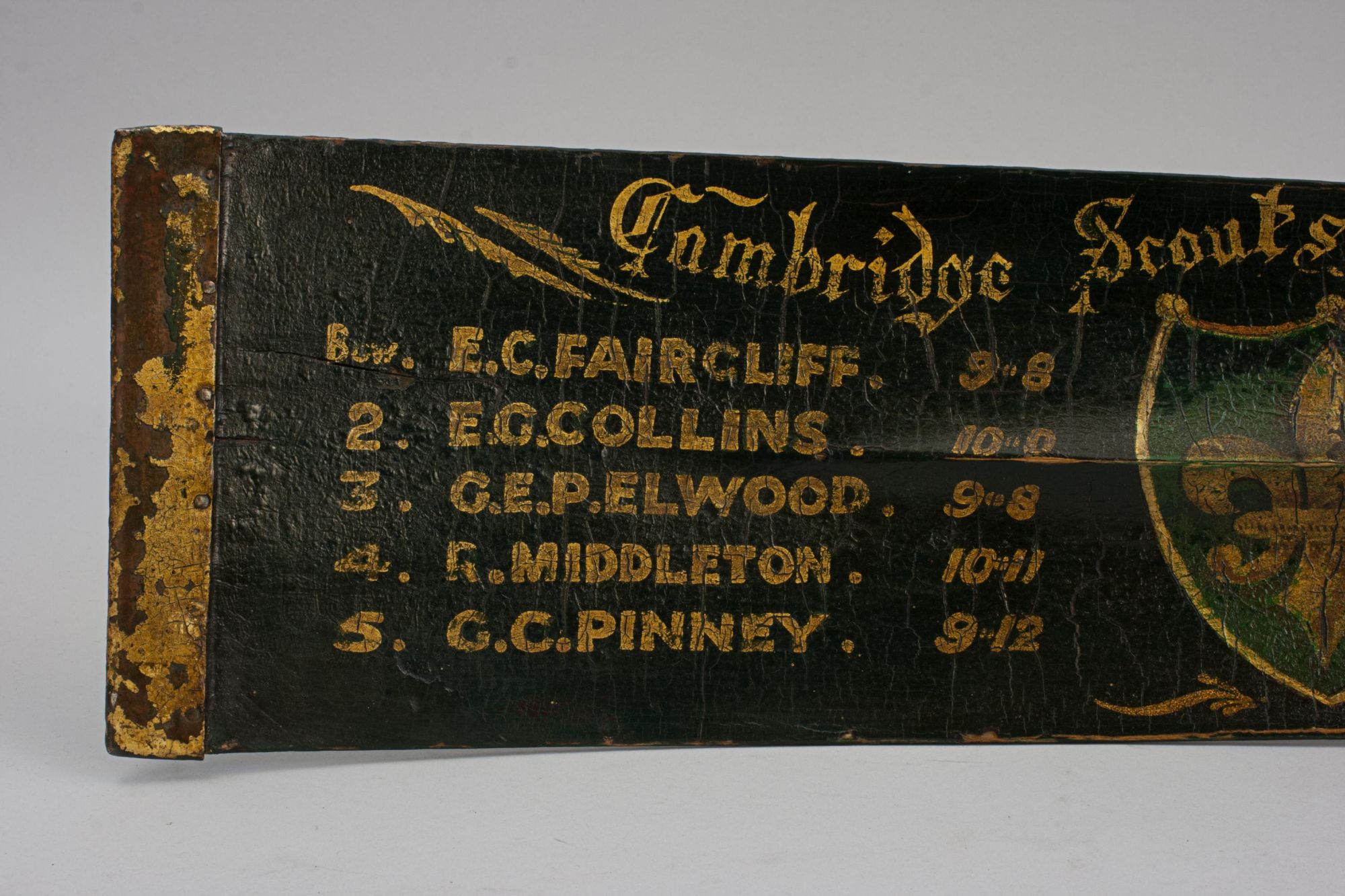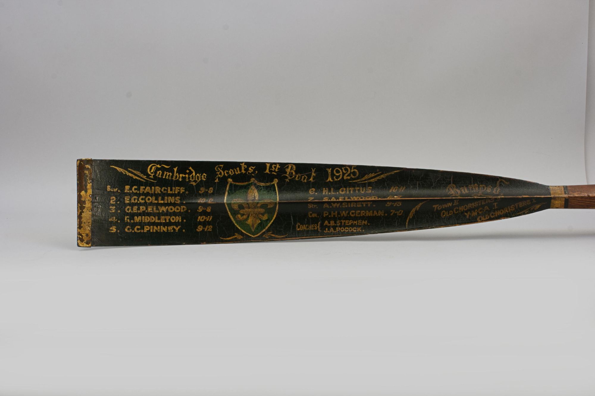 The full-length oar is an original traditional presentation rowing oar with gilt calligraphy, the crew's names and weights and the Scouts emblem. The Cambridge Scout Boat Club was formed in 1923 and was successful from the start, they were Head of the River on three occasions.