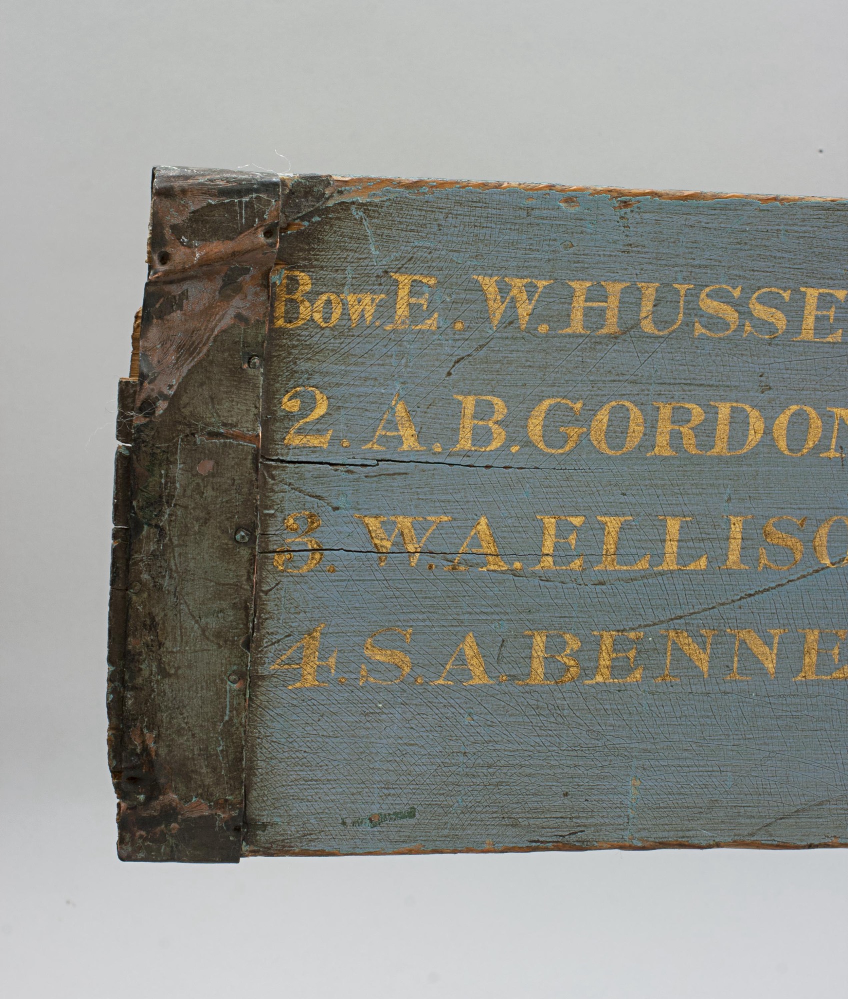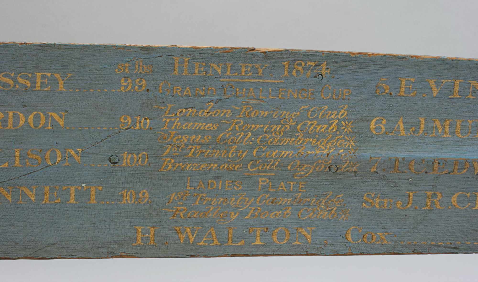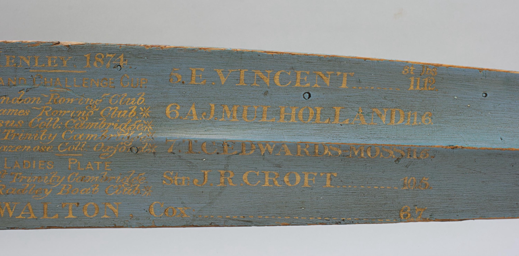 This oar remains in fine, original condition, with clear gilt lettering on a light blue ground, showing only gentle age wear consistent with its age and authenticity. It represents a rare survival from the early era of British competitive rowing and from one of the sport's most storied institutions.