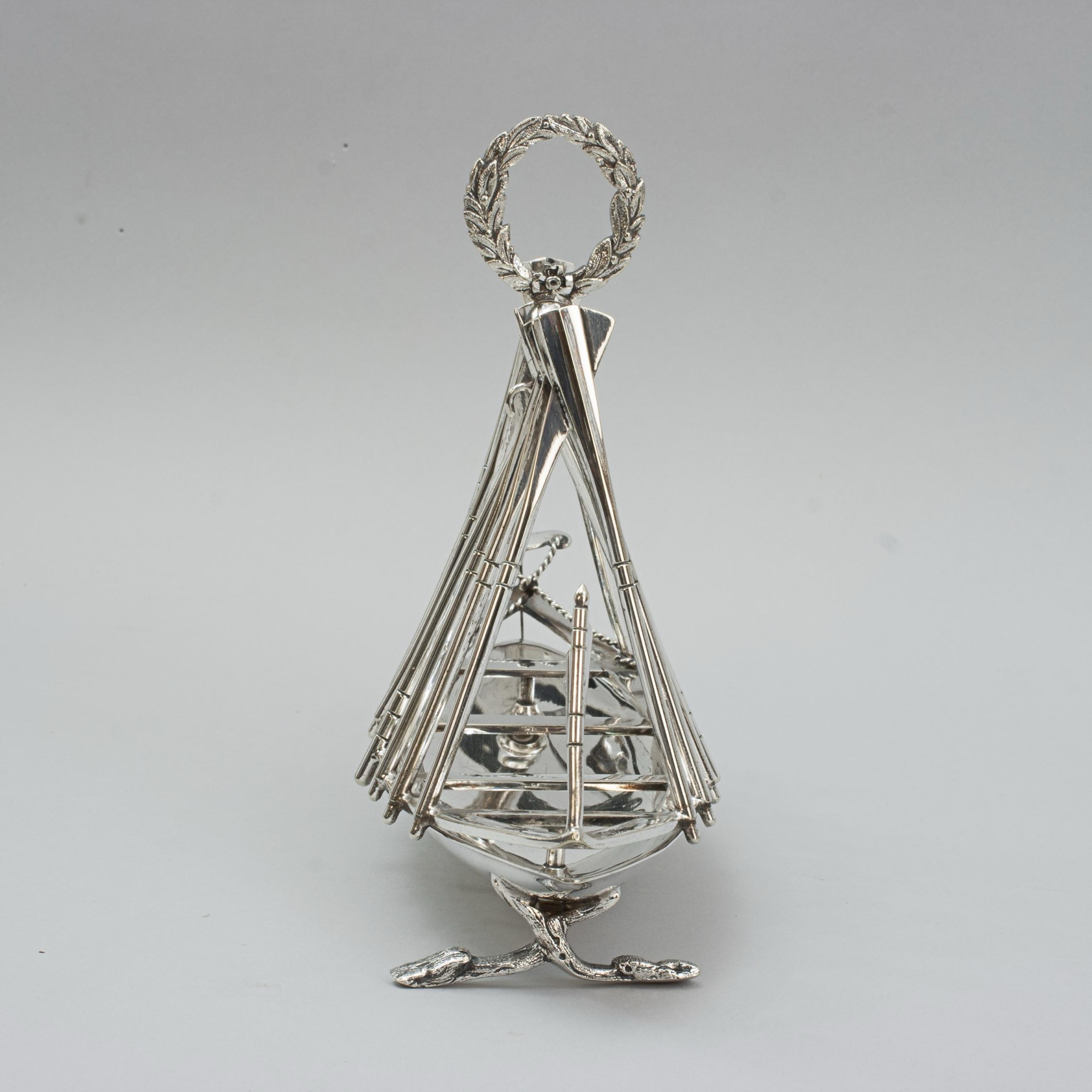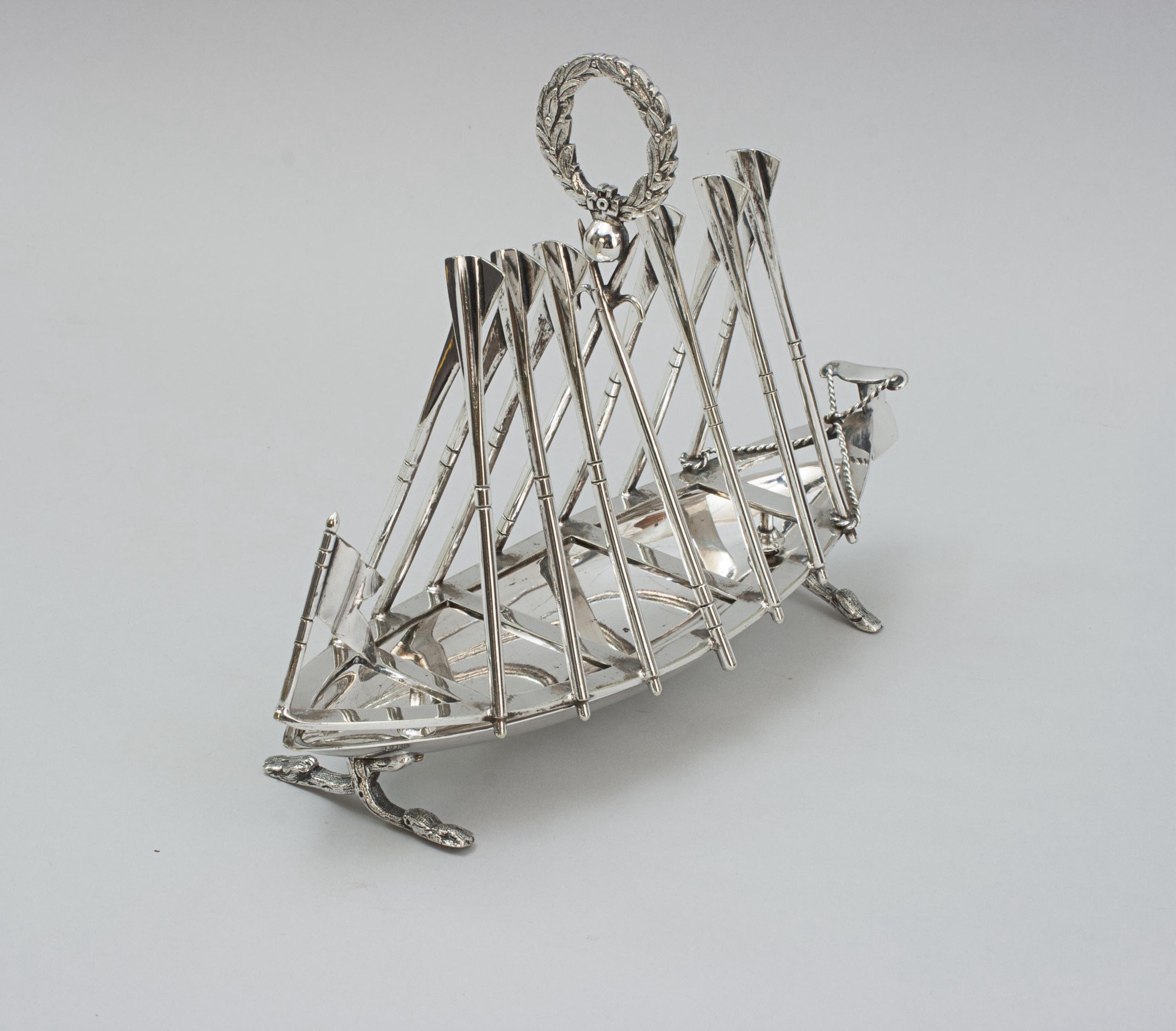 A Victorian silver plated rowing toast rack which can also be used as a letter rack or napkin holder. The dividers are in the shape of crossed oars, the central divider with a laurel wreath handle. The base in the form of a rowing scull with rudder.