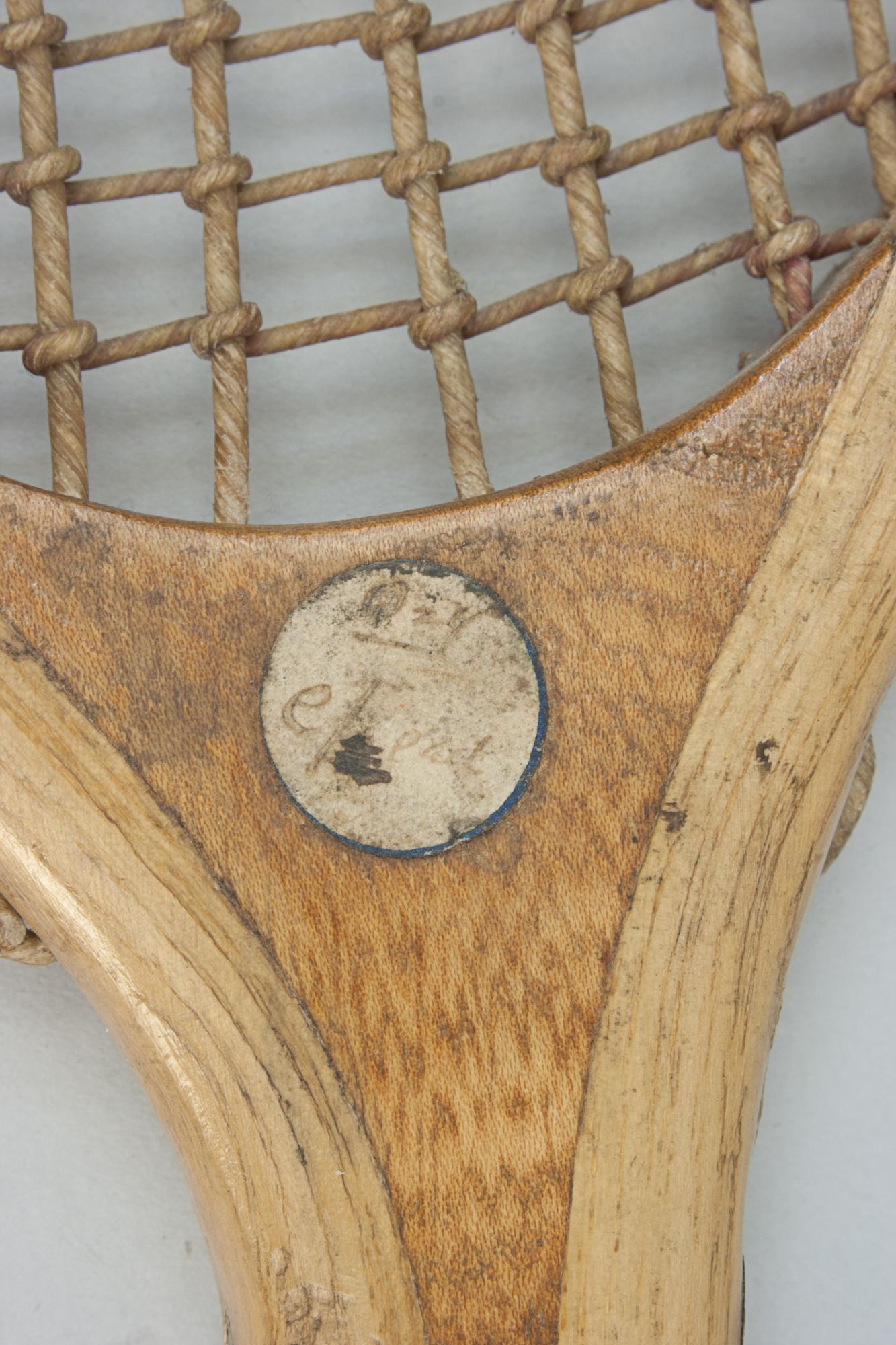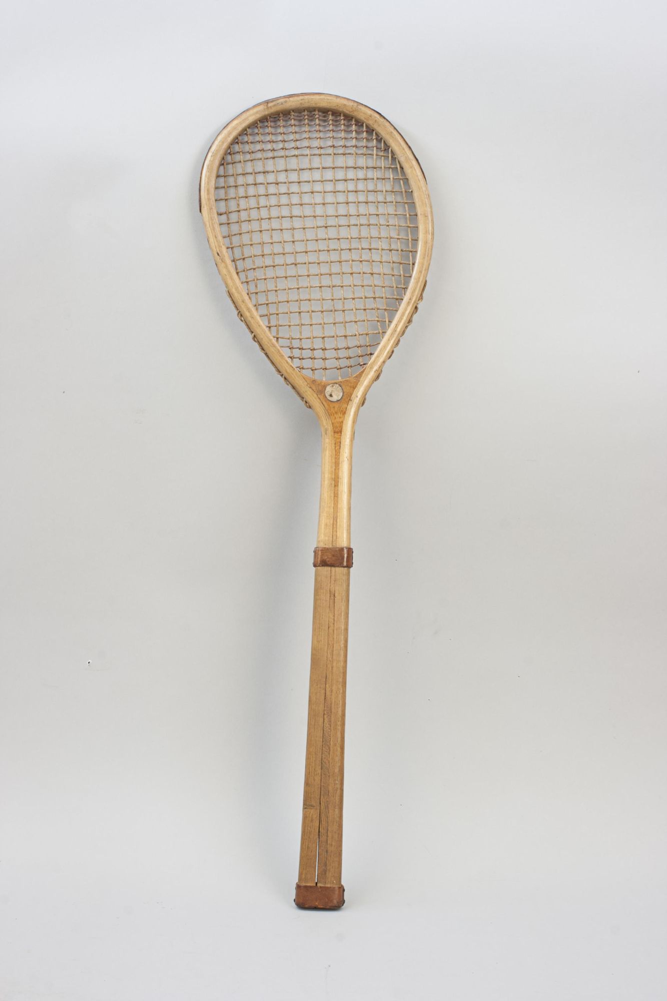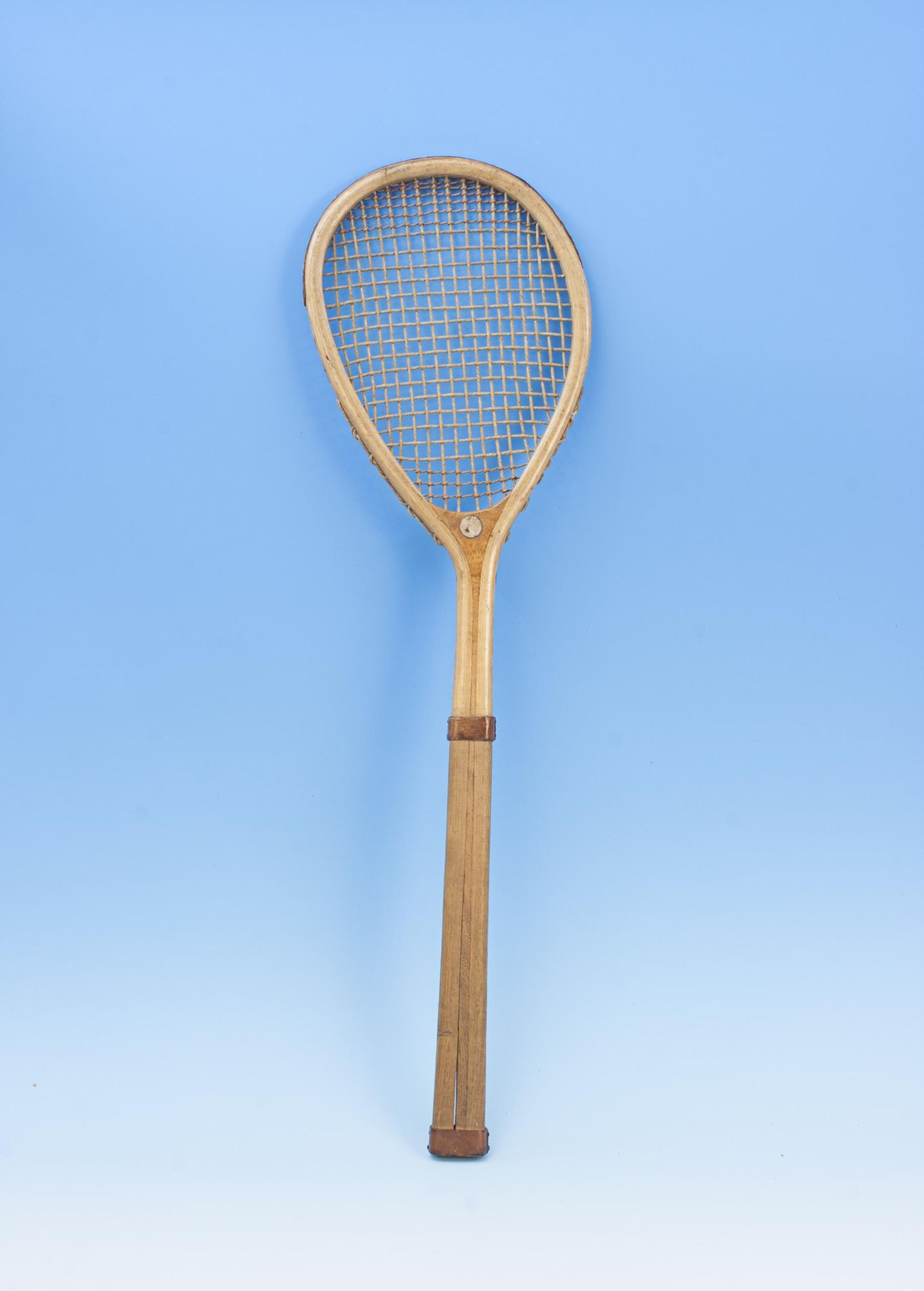 A rare, early lopsided (tilt head or teardrop shape) lawn tennis racquet in good original condition. The fine ash lop sided frame is in very good condition (handle slightly separated) and is very lightweight, probably a similar age as a Major Walter Clopton Wingfield's Sphairistike racket which were sold around 1874 and 1875. The walnut concave wedge bears no maker's stamp, but a round paper label. The original period thick gut stringing is in excellent condition, featuring six rows of trebling at the top and three at the bottom. The handle grip is made up of the ash frame with part of the walnut wedge, finished with a leather butt strip and a leather collar. Interestingly you would expect to find a white kid leather grip on this type of racket, but from appearances this has never had one fitted. The round paper