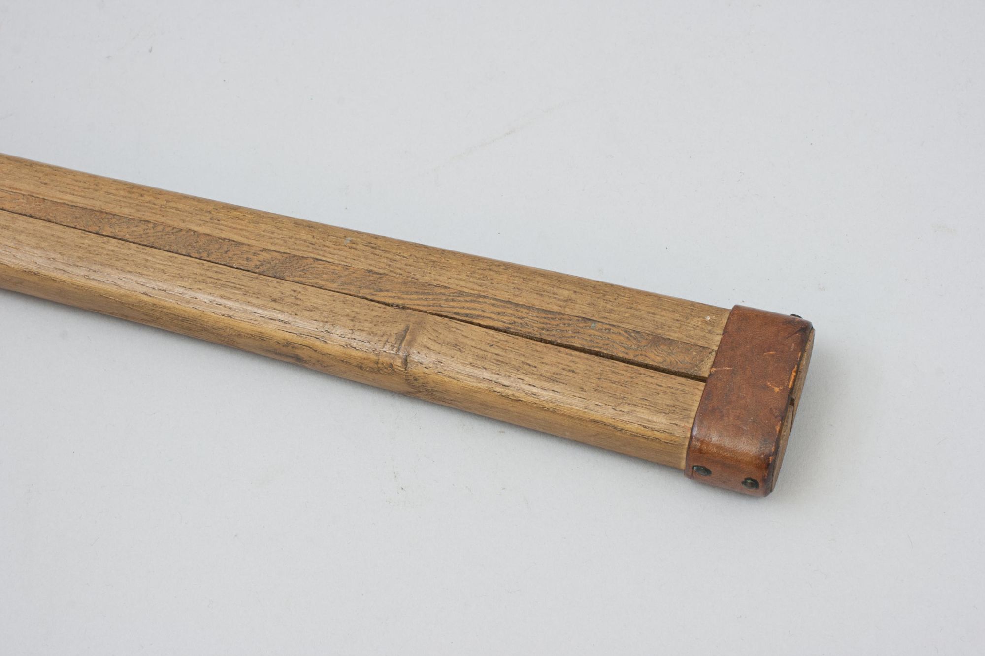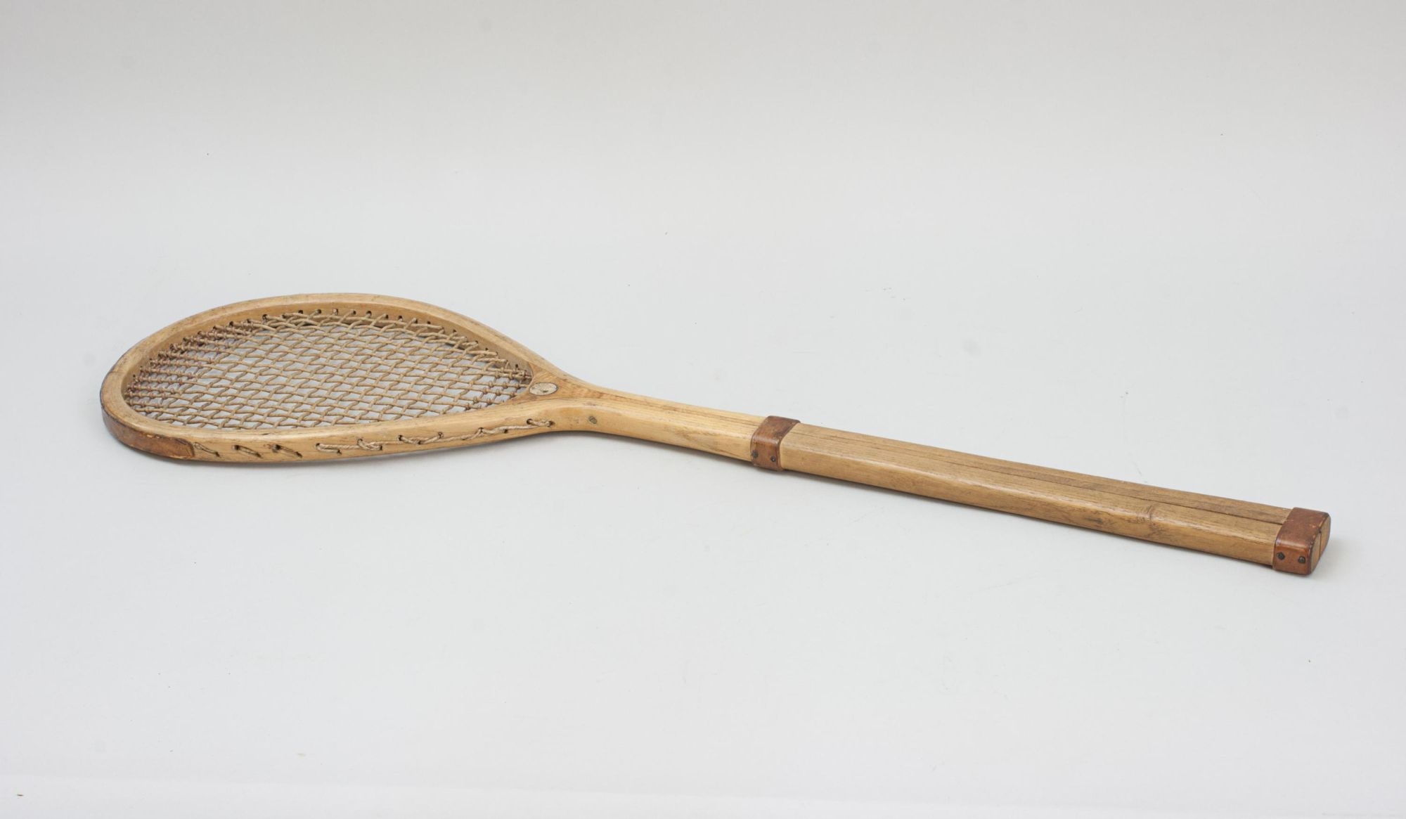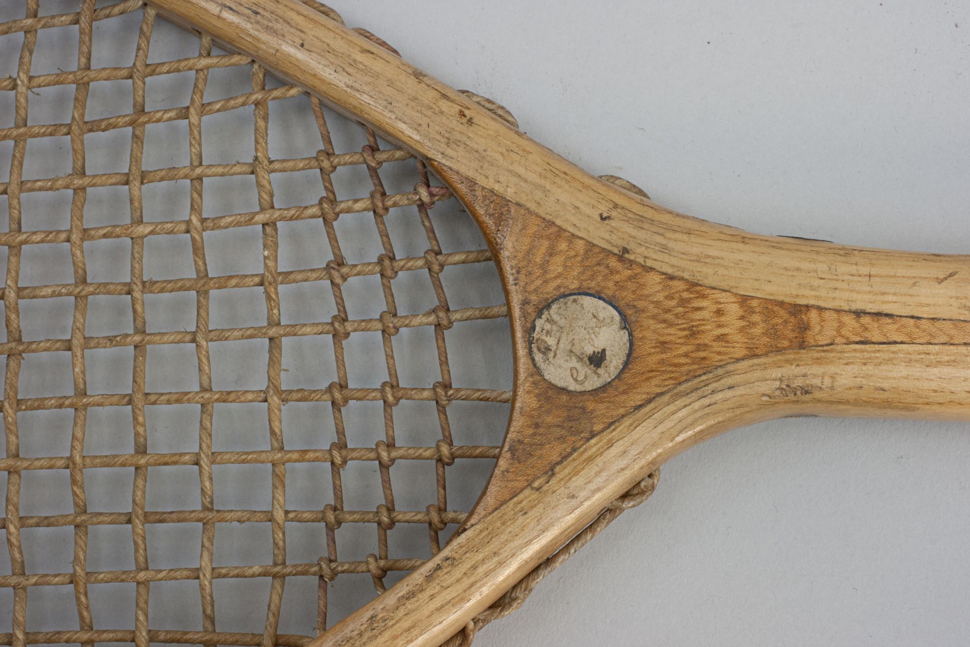 A rare, early lopsided (tilt head or teardrop shape) lawn tennis racquet in good original condition. The fine ash lop sided frame is in very good condition (handle slightly separated) and is very lightweight, probably a similar age as a Major Walter Clopton Wingfield's Sphairistike racket which were sold around 1874 and 1875. The walnut concave wedge bears no maker's stamp, but a round paper label. The original period thick gut stringing is in excellent condition, featuring six rows of trebling at the top and three at the bottom. The handle grip is made up of the ash frame with part of the walnut wedge, finished with a leather butt strip and a leather collar. Interestingly you would expect to find a white kid leather grip on this type of racket, but from appearances this has never had one fitted. The round paper
